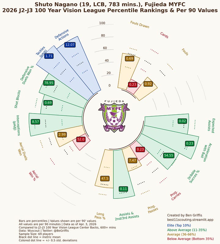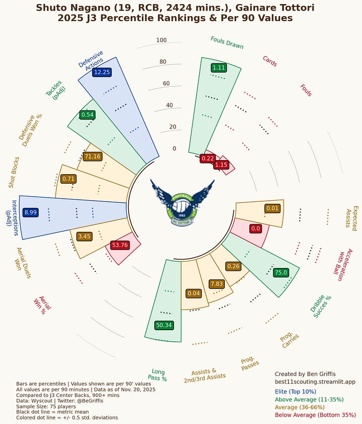 For now, I don’t see Shuto Nagano making the step up to Europe until the summer of 2027 at the earliest3. I don’t think there’s any reason to rush him especially given his decision-making and consistency issues that can only be improved with time. I would continue monitoring his progress as his skill-set is valuable to any team that wants their Center Backs to be pro-active in the build-up phase and then join attacks further forward.